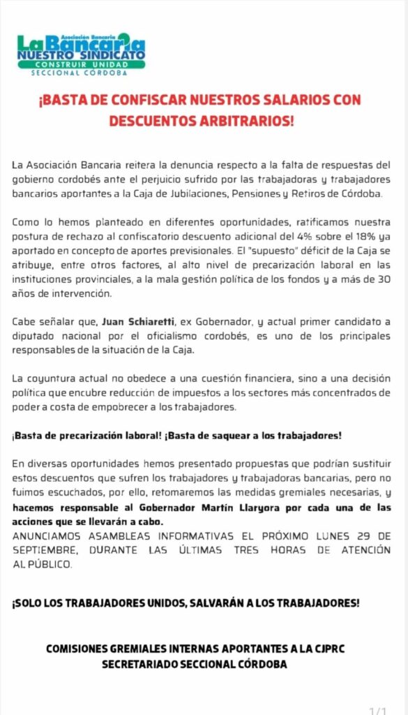 En el comunicado difundido por La Bancaria, se advierte claramente que “en diversas oportunidades hemos presentado propuestas que podrían sustituir estos descuentos que sufren los trabajadores y trabajadoras bancarias, pero no fuimos escuchados, por ello, retomaremos las medidas gremiales necesarias, y hacemos responsable al gobernador Martin Llaryora por cada una de las acciones que se llevarán a cabo”.