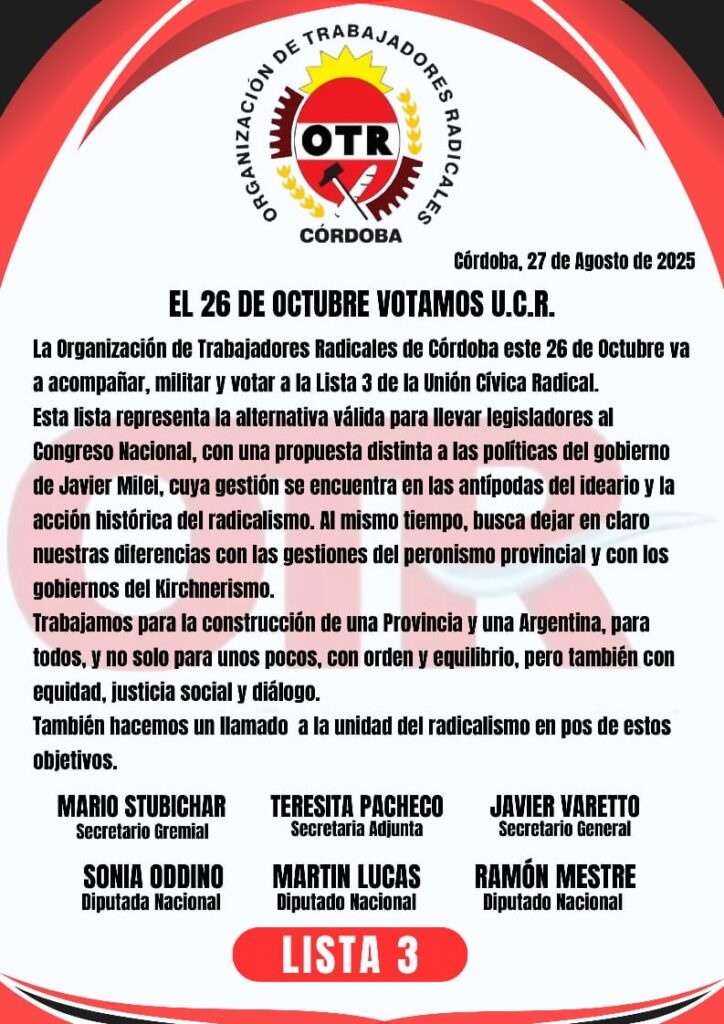 El presidente del Congreso Nacional de la OTR criticó el viraje a la derecha del partido centenario y reivindicó que “en la Convención de Gualeguaychú, los convencionales de la OTR votamos orgánicamente contra la alianza con (Mauricio) Macri y la derecha; claramente nos opusimos a Cambiemos. La única expresión formal del Partido que se manifestó críticamente a la alianza con Macri fue la Organización de Trabajadores Radicales”. También le apuntó a la actual alianza de sectores derechistas del radicalismo con la ultraderecha de La Libertad Avanza (LLA) como el caso extremo del diputado cordobés Luis Picat y el colaboracionismo de los diputados Rodrigo de Loredo o Soledad Carrizo; o del mendocino Luis Petri, que dejó la UCR y se afilió a LLA, el líder de la OTR cordobesa le dijo a Mayo!: “Lo del ministro Petri es una clara manifestación de que hay afiliados que no son radicales, en el radicalismo de Mendoza, que ha tenido preeminencia en el Comité Nacional, lo venimos viendo desde hace mucho con (Alfredo) Cornejo y la transversalidad kirchnerista; con (Julio) Cobos vice de Cristina Kirchner y con (Ernesto) Sanz como furgón de cola del macrismo; privilegiaron sus apetencias personales por sobre la ideología partidaria”.